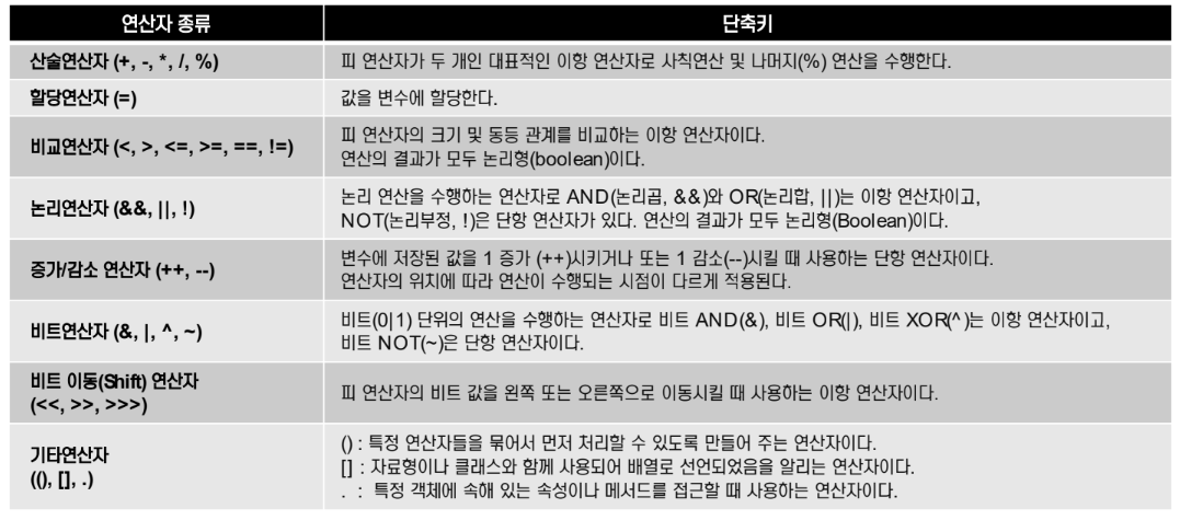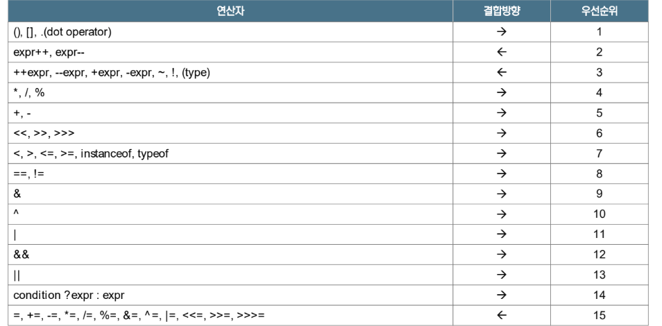 - 연산자에는 산술연산자,할당연산자,논리연산자 등 많은 연산자들이 존재하며 이들 간에는 우선순위가 존재한다.