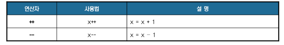 - 변수의 앞이나 뒤에 붙어서 변수의 값을 1 증가시키거나 또는 1 감소시키는 단항 연산자이다.