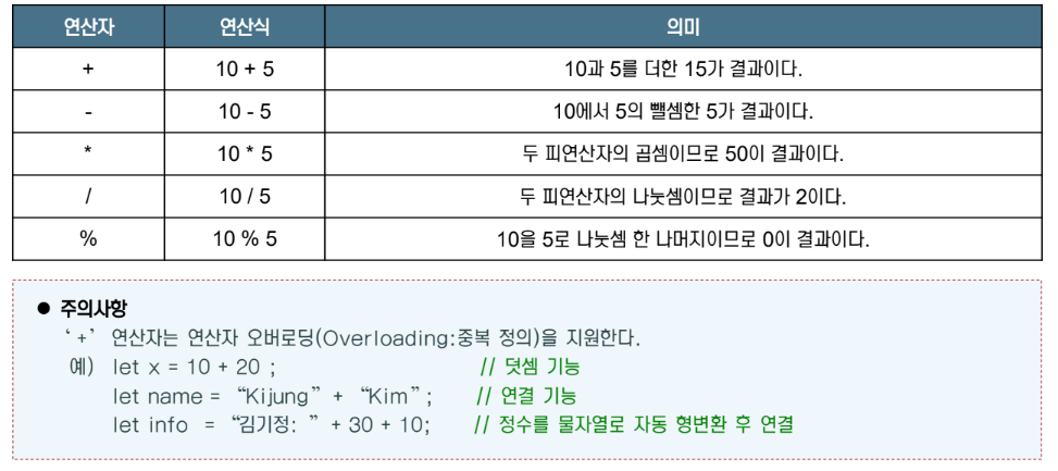 - 피 연산자가 두 개인 대표적인 이항 연산자로 사칙연산 및 나머지(%) 연산을 수행한다.