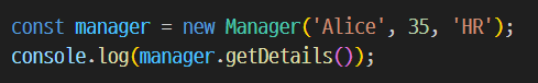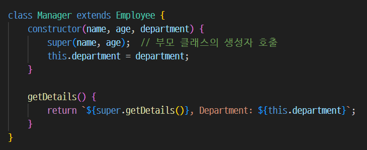 Manager 클래스는 Employee 클래스를 상속받아 department 프로퍼티를 추가하고 getDetails 메소드를 재정의합니다.