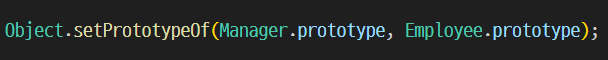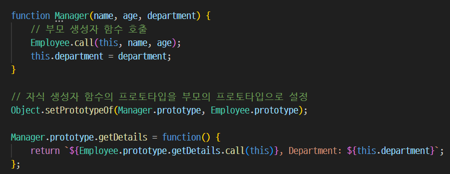 Manager 생성자 함수는 Employee 생성자 함수를 호출하여 name 과 age 를 초기화하고 추가로 department 프로퍼티를 설정합니다. 또한 Object.setPrototypeOf 를 사용하여 Manager의 프로토타입을 Employee의 프로토타입으로 설정합니다.