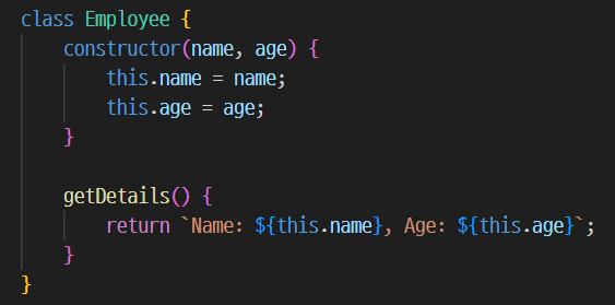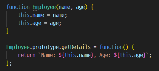 Employee 생성자 함수는 name 과 age 라는 두 개의 프로퍼티를 초기화하고 getDetails 라는 메소드를 정의합니다.