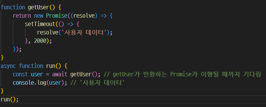 - async 키워드를 함수 앞에 붙이면 그 함수는 항상 Promise를 반환합니다.