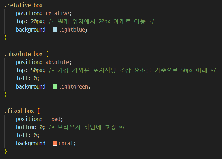 - absolute : 가장 가까운 포지셔닝 조상 요소를 기준으로 배치. 흐름에서 완전히 빠짐.