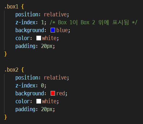'z-index' 속성은 요소의 z축(앞뒤) 위치를 설정할 때 사용합니다. 값이 클수록 앞쪽에서 배치되며 기본값은 0입니다.