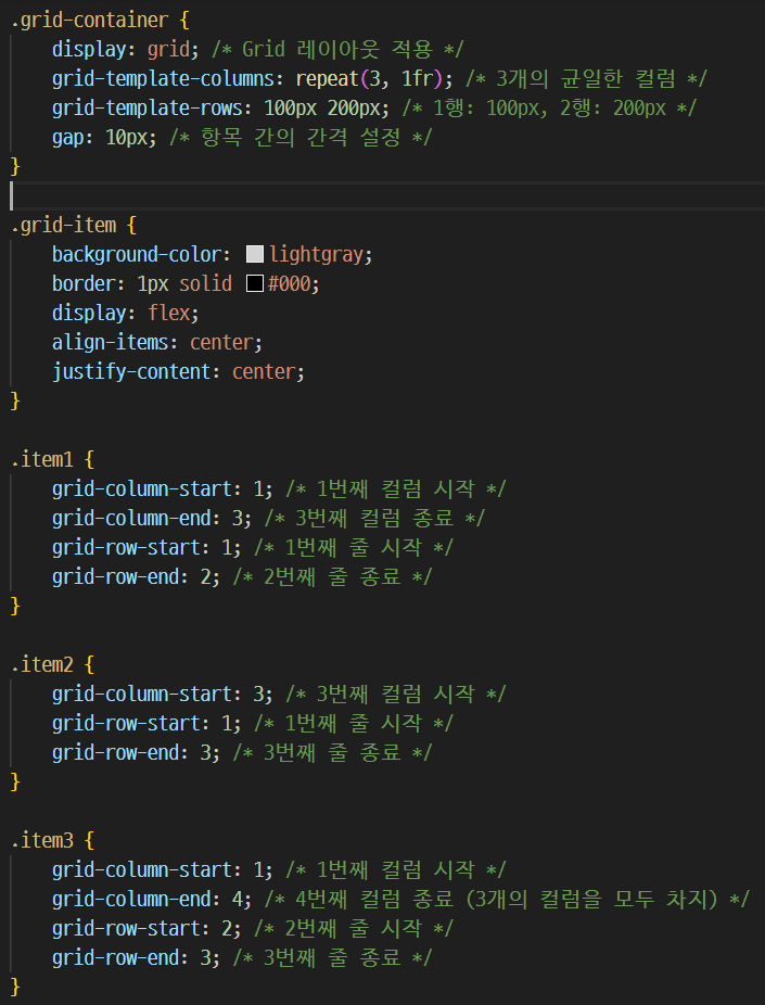 - grid-column-start , grid-column-end : 컬럼 시작 및 종료 라인 설정