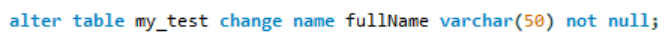 alter table 테이블명 change 컬럼명 변경할컬럼명 바꿀자료형(길이) 제약조건;