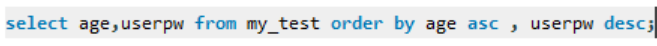 age를 기준으로 정렬(오름)를 했을때 age의 값이 같은 것이 있으면 두번째 컬럼인 userpw 컬럼으로 정렬(내림)을한다