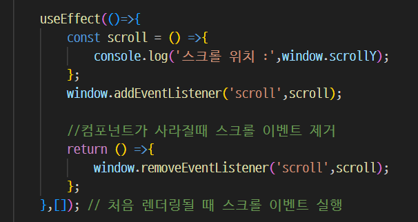 이 코드에서는 컴포넌트가 처음 렌더링될 때 스크롤 이벤트 리스너를 등록하고 컴포넌트가 사라질때 해당 이벤트 리스너를 제거 합니다.