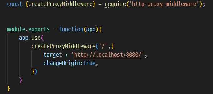 이 코드는 createProxyMiddleware 함수를 불러오고 이 함수는 프록시 서버를 설정하기 위한 미들웨어를 생성합니다.