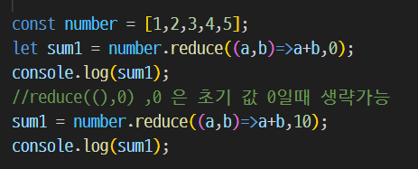 reduce() : 배열의 각 요소에 대해 주어진 리듀서 함수를 실행하고 하나의 결과값을 반환합니다.